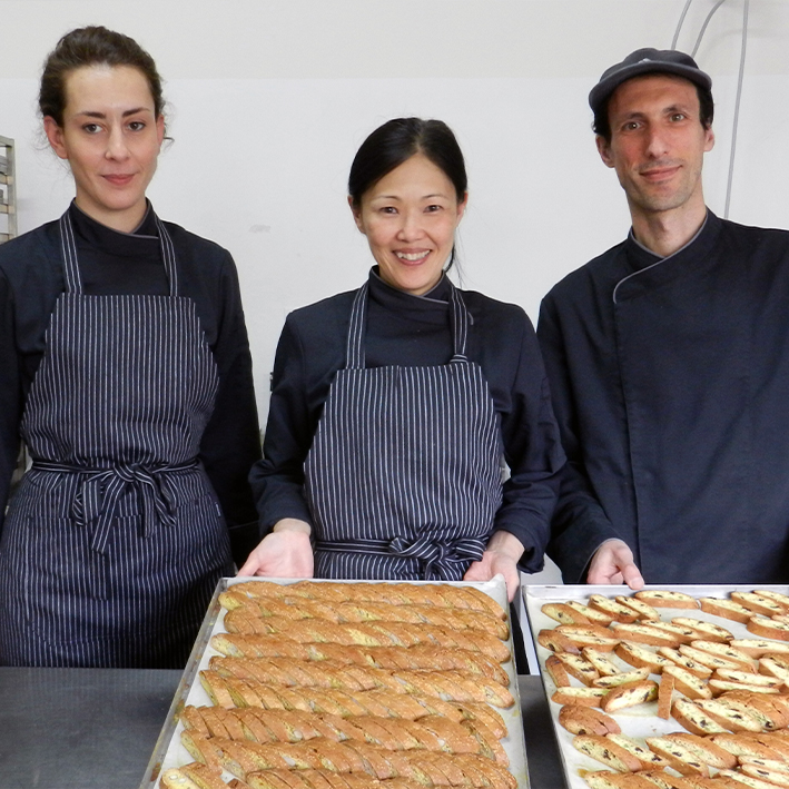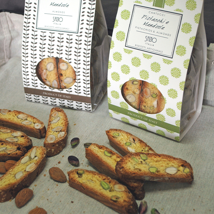Diese krossen Cantucci vereinen selbst geröstete Mandeln (12 %) und Pistazien (10 %) aus Sizilien mit italienischem Weizen und frischen Eiern. Diese Mischung aus Nüssen und dem knusprigen Teig macht sie zu einer edlen Begleitung für Dessertweine oder einen starken Espresso.