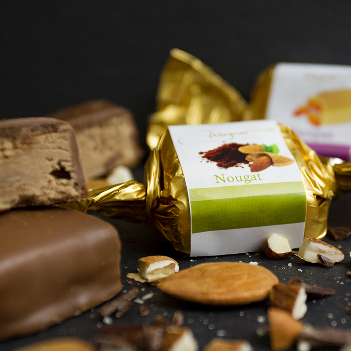 Ein echter Klassiker von Wagner: Der Nougathappen, eine Mandel-Sahne-Praline, die mit 25 % gehobelten Mandeln und feiner Vollmilchschokolade zubereitet wird. Die zartschmelzende Konsistenz und der nussige Geschmack machen diesen Happen zu einer unwiderstehlichen Leckerei, die besonders gut zu Kaffee passt. Fein, edel und perfekt für den kleinen Luxusmoment zwischendurch. Ideal als Begleiter zu einem Cappuccino oder Espresso.