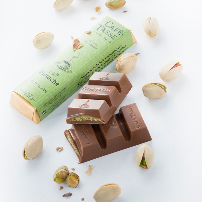 A bar of melt-in-the-mouth milk chocolate (38%) filled with a creamy pistachio filling. A delicious snack for between meals, ideally packaged in a sales display.