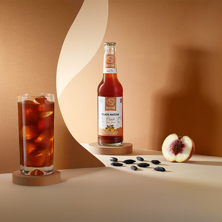A refreshing drink based on matcha tea, served in a practical glass bottle. With 1.3 g of original Ceremonial Black Matcha and the unique taste of peach, refined with a hint of tonka bean, this drink brings pure enjoyment to your everyday life. *Deposit bottle.
