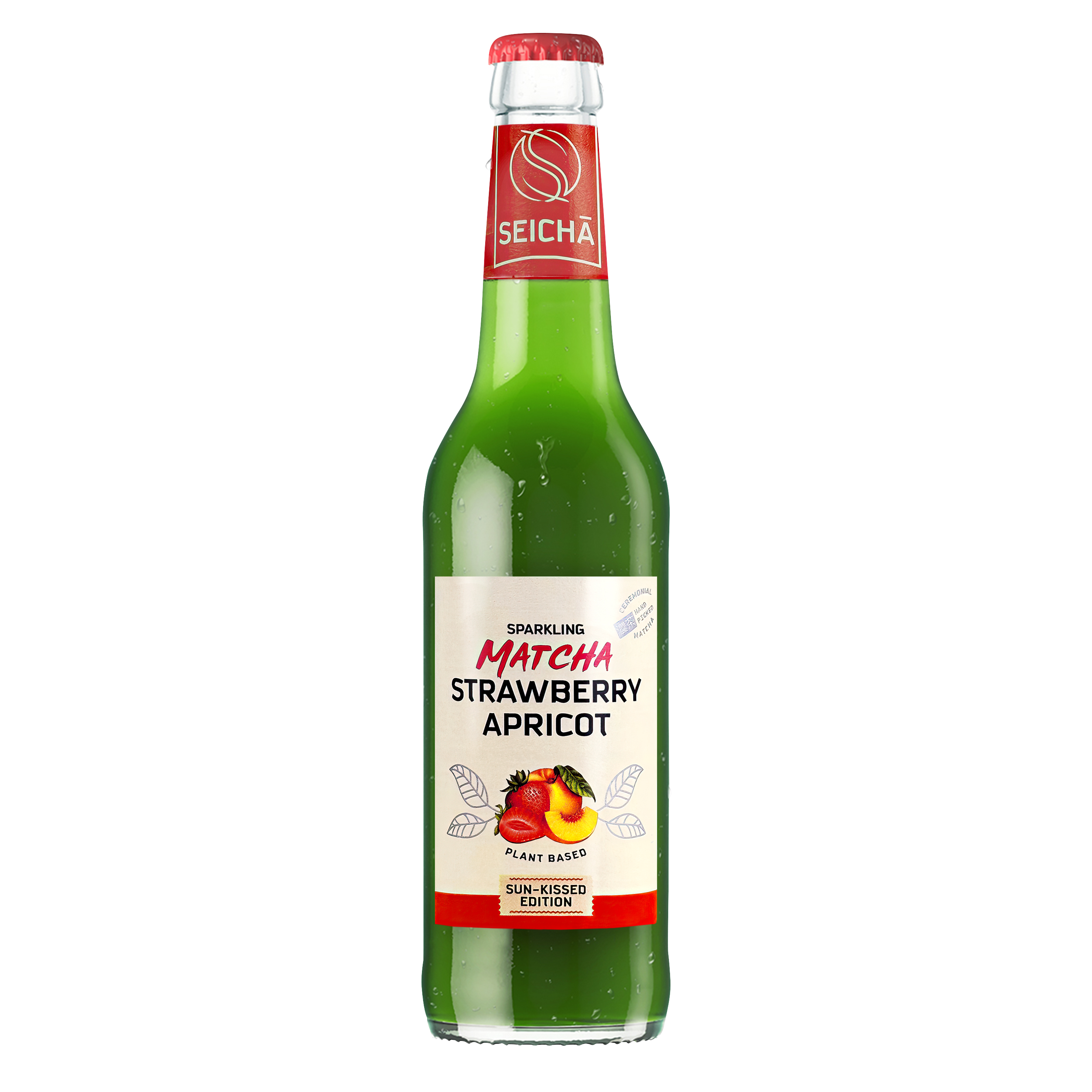 Our sparkling refreshing drink in a glass bottle combines 1.3 g of original Ceremonial Matcha tea with the delicious taste of strawberry and peach. This drink offers a natural energy boost and fruity refreshment, perfect for a break in your daily routine. Packed in practical disposable deposit bottles.