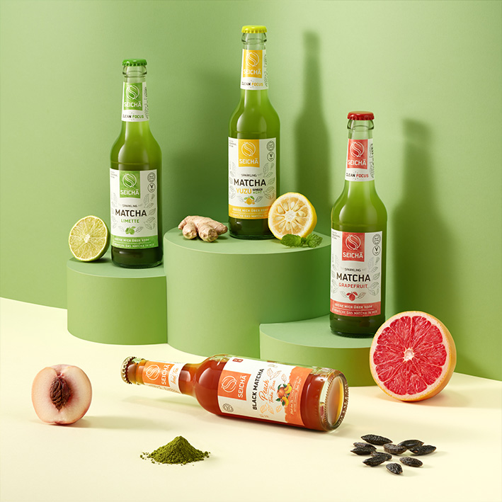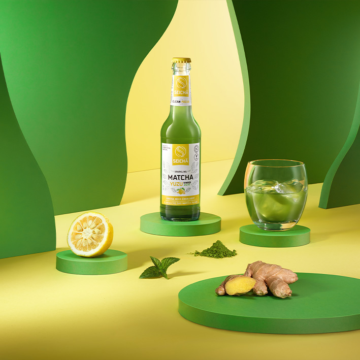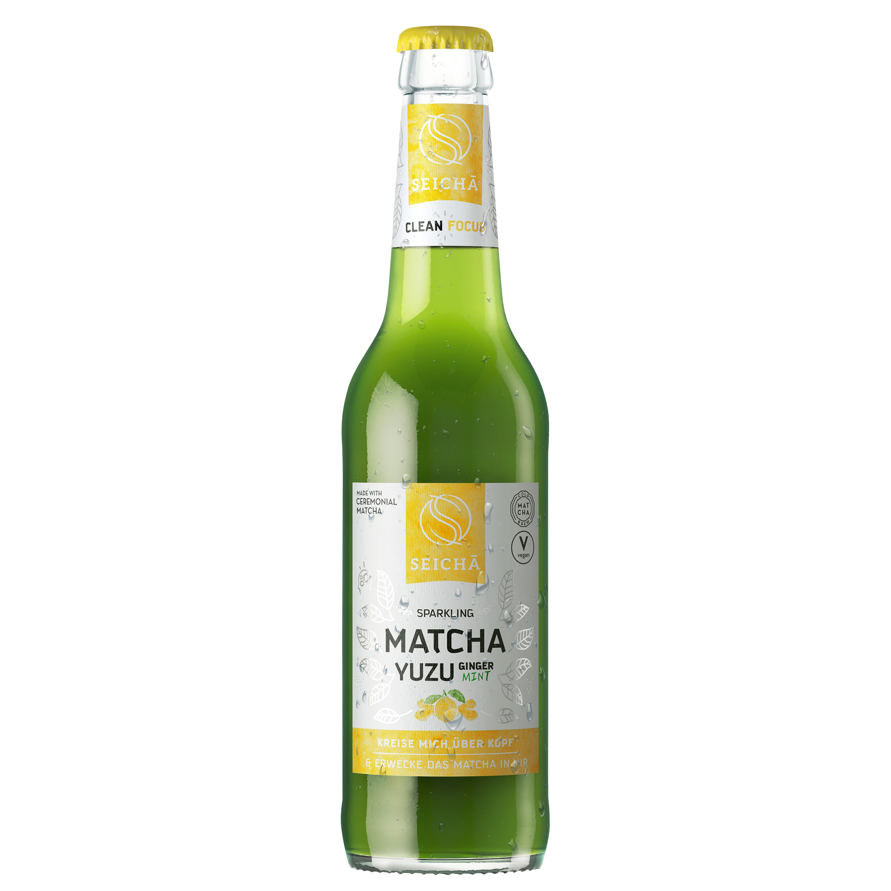 Infusion of matcha tea (water, 1.3g matcha tea), cane sugar, yuzu juice (2%), ginger juice (1.5%), lime juice concentrate (0.5%), carbonic acid, natural spearmint aroma, natural aroma, acerola extract, lemon juice concentrate, color: Copper chlorophyllin. Fruit content 4%.