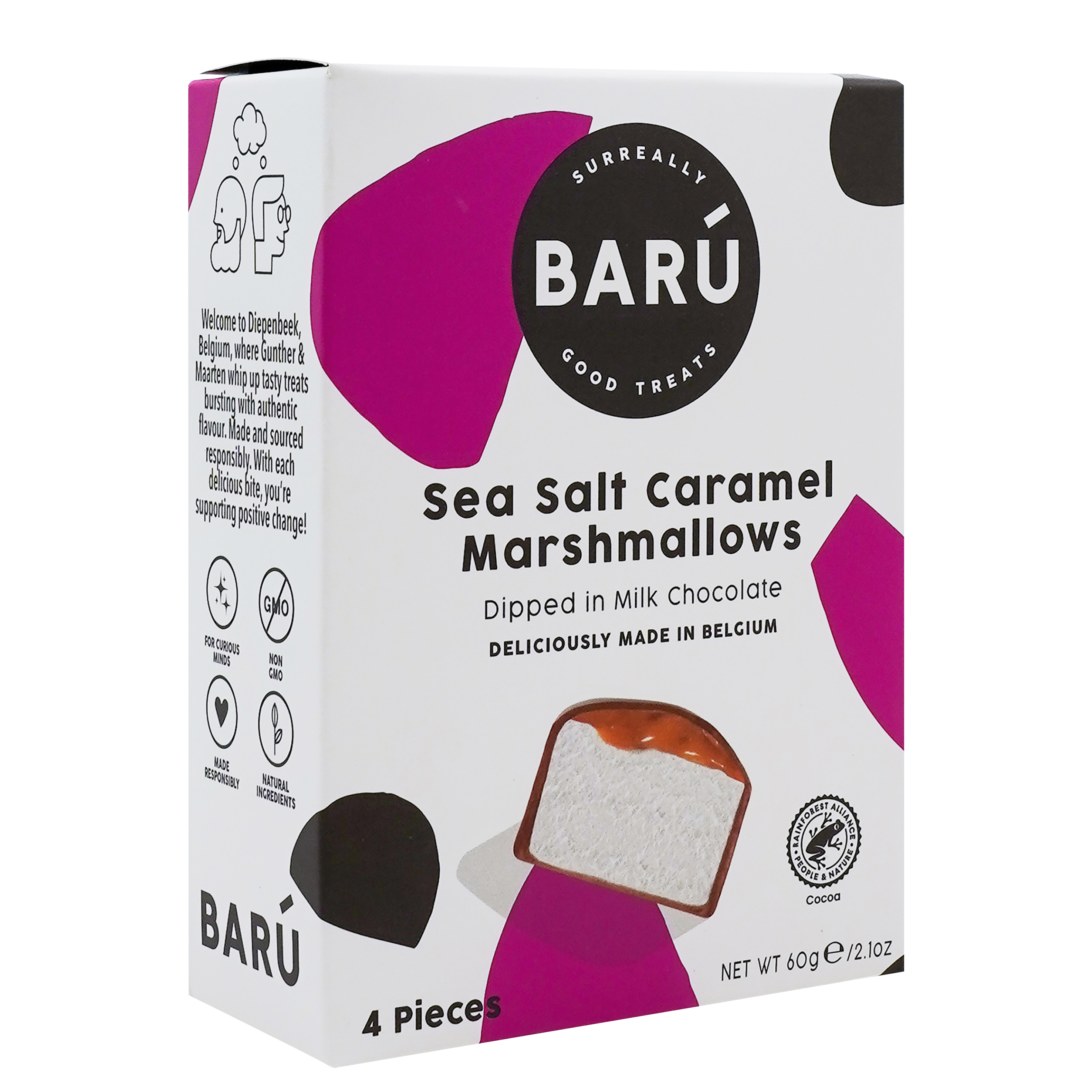 Crunchy, tender marshmallows, coated in Belgian milk chocolate (40%) and refined with a creamy salted caramel flavor. This combination of sweetness and salt provides a real moment of pleasure and makes them an irresistible snack.