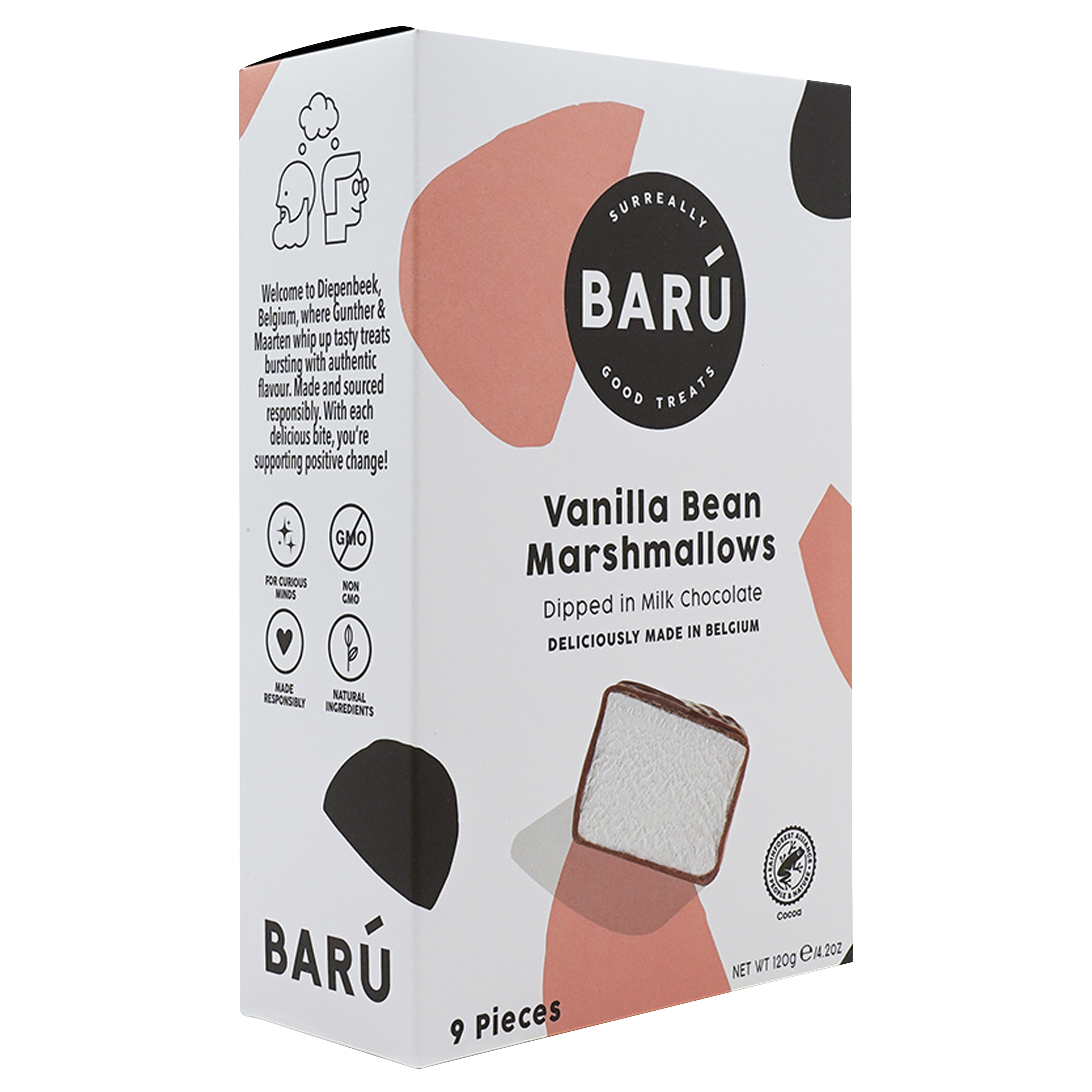 Marshmallows, refined with honey and vanilla, coated in creamy Belgian milk chocolate. A crunchy, delicate taste experience that will delight both chocolate and marshmallow lovers.