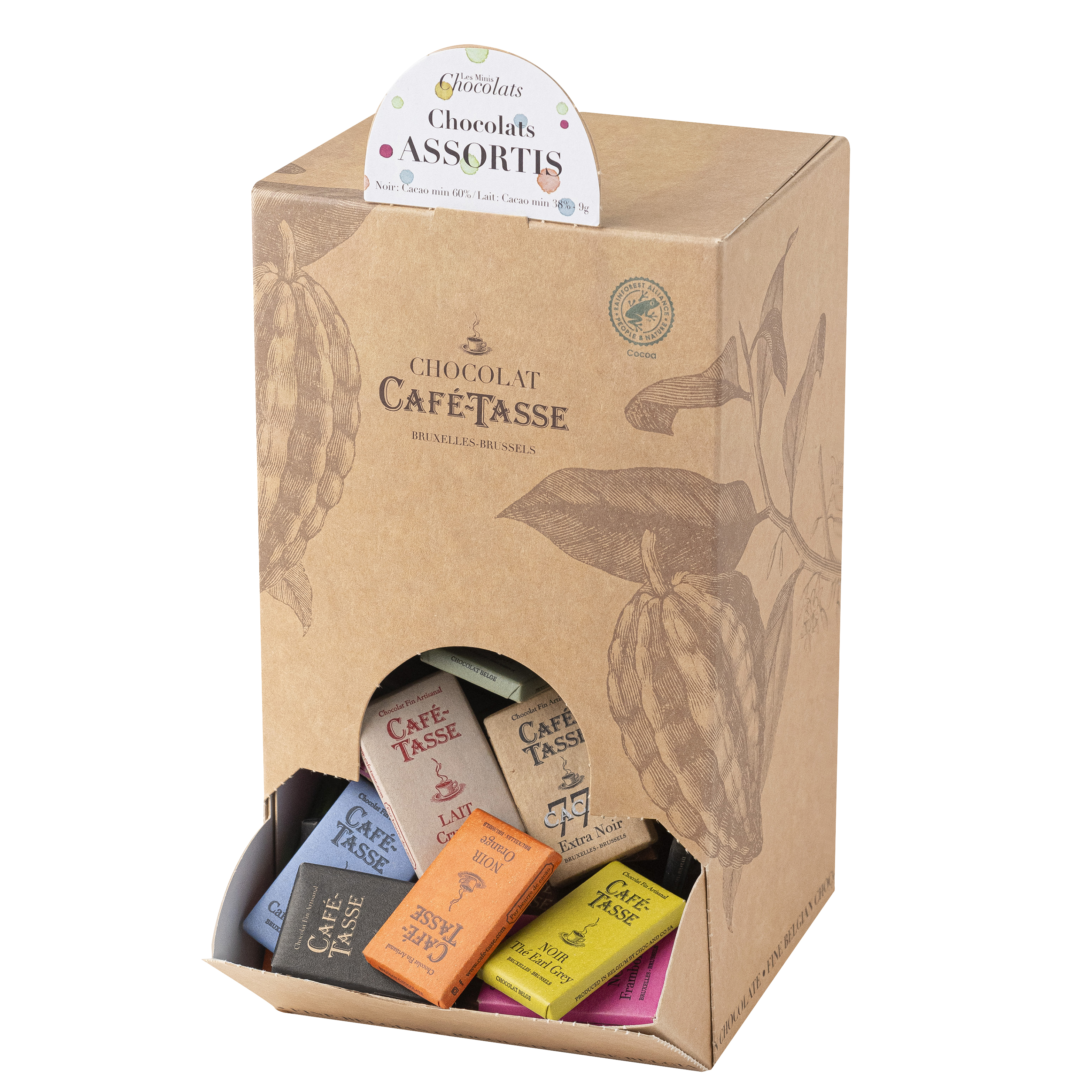 14 varieties in a mixed display: dark (77%), dark (pure, Earl Grey, orange, raspberry, fleur de sel), milk (coffee, nougat, hazelnut, salted caramel, coconut, crunchy) and white chocolate (coffee, matcha). A chocolate dream for every taste - perfectly presented and irresistibly delicious. Treat yourself and your customers to moments of indulgence with this exquisite selection! Chocolate in all its facets - pure pleasure.