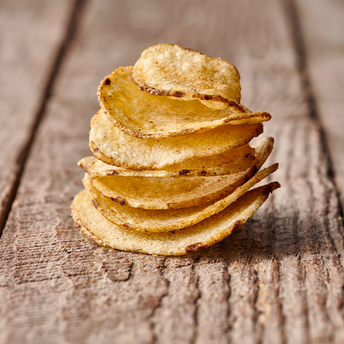 Vacuum frying enables us to keep the temperatures constantly low during the production of the crisps. Thanks to the lower and ideal temperature, this production technology ensures that the crisps contain less fat than snacks fried at normal pressure, as the water from the potatoes evaporates more quickly until a delicious crust and the typical roasted flavours develop. Less fat, less acrylamide. The colour of the crisps is more natural, the taste is more intense and the crust is crispier.