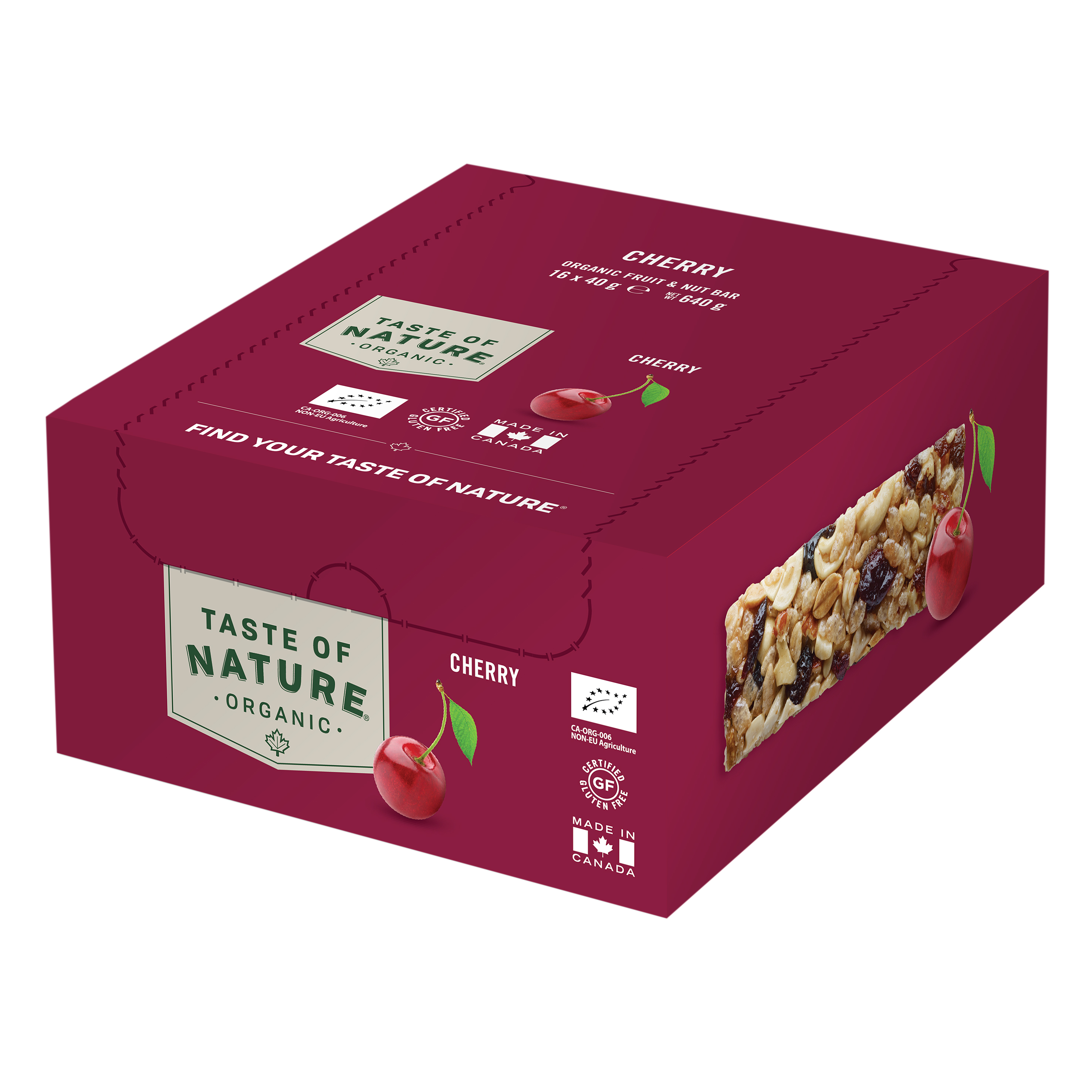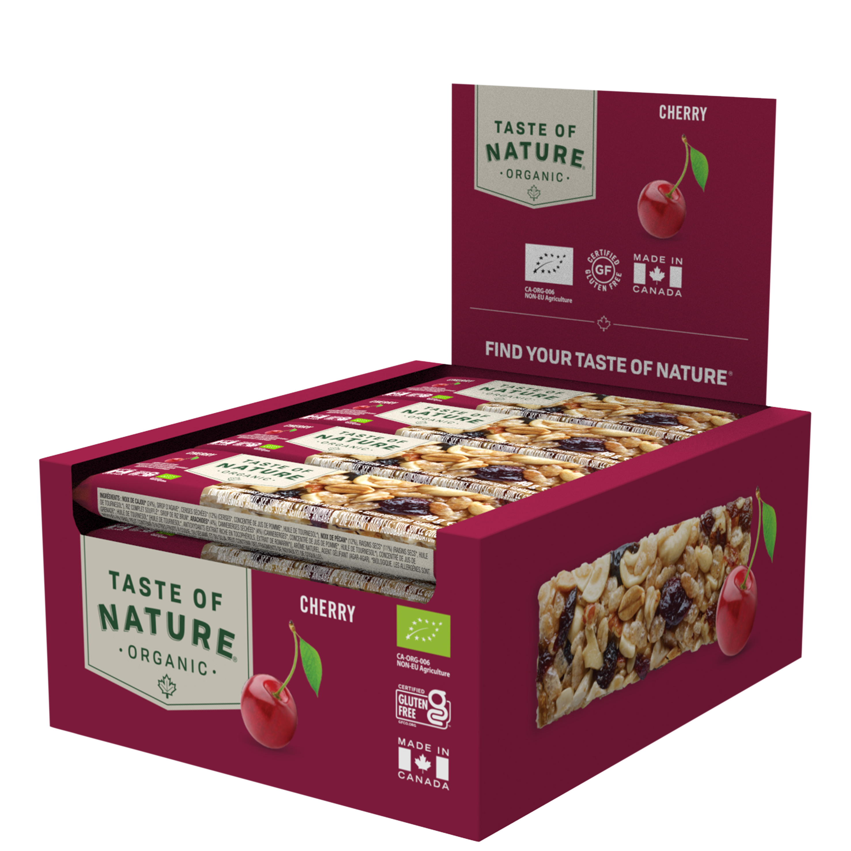 CASHEWS* (24%), agave syrup*, dried cherries* (12%) (cherries*,apple juice concentrate*, sunflower oil*), PECANS* (12%), raisins* (11%) (raisins*, sunflower oil*), whole grain crisp brown rice*, brown rice syrup*, PEANUTS* (4%), dried cranberries* (4%) (cranberries*, apple juice concentrate*, sunflower oil*), pomegranate juice concentrate*, sunflower oil blend* (sunflower oil*, antioxidants: mixed tocopherols, rosemary extract*), natural flavouring, gelling agent: agar. *organic.