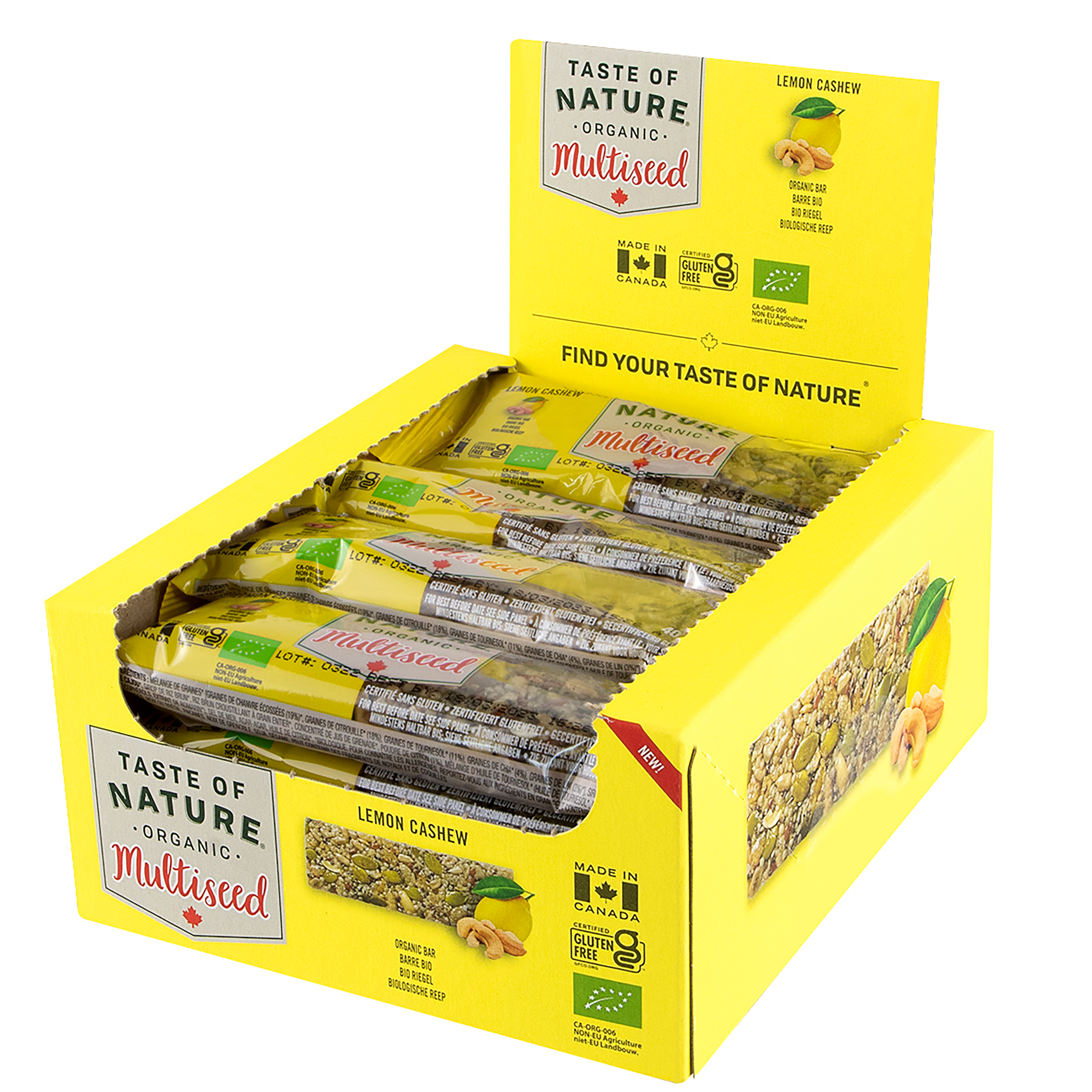 This cashew bar with a hint of lemon flavor makes for a refreshing and filling snack. Complemented by a mixture of pumpkin seeds, sunflower seeds, hulled hemp seeds, chia seeds and linseed, it not only provides enjoyment but also valuable nutrients. Perfect for an energy-rich start to the day or as a snack between meals. Organic Certification No.: CA-ORG-006