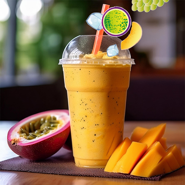 Water, grape juice concentrate, banana pulp, passion fruit juice concentrate, mango pulp concentrate, guava pulp, stabilisers: xanthan gum (E415), pectin (E440), sodium carboxymethyl cellulose (E466); natural flavouring (banana, mango, passionfruit), antioxidant: ascorbic acid (E300), green tea extract. 100 g multi-fruit preparation made from 225 g fruit (of which 181 g grape, 33 g passion fruit, 8 g banana, 2 g mango, 1 g guava). Origin of fruit: EU & non-EU. No added sugar, naturally contains sugar.