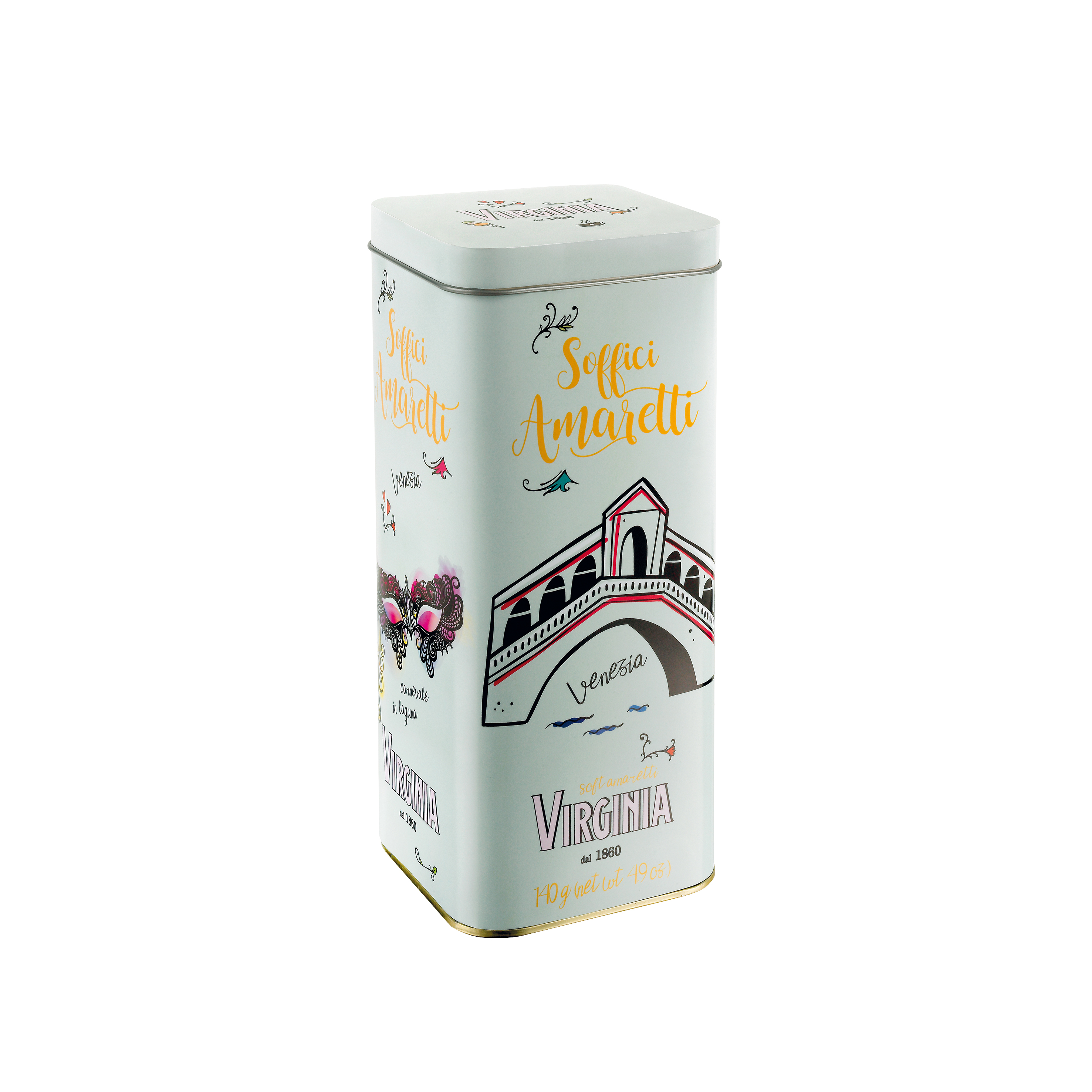Colorfully wrapped soft amaretti with 36% apricot kernels and 7.5% almonds, packaged in a beautiful metal tin with three different city motifs. These fine amaretti are a delight for all the senses - not only in terms of taste, but also visually. The ideal gift idea for lovers of Italian delicacies and anyone looking for a high-quality sweet snack.