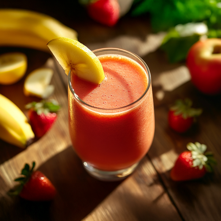 100% fruit in a bottle. A delightfully fruity blend of sweet strawberries, zesty lemon, and crisp apples that delivers pure freshness and a wonderful summer feeling. The perfect snack – whether for breakfast, after a workout, or simply on the go. Made with 100% fruit. Nothing else.