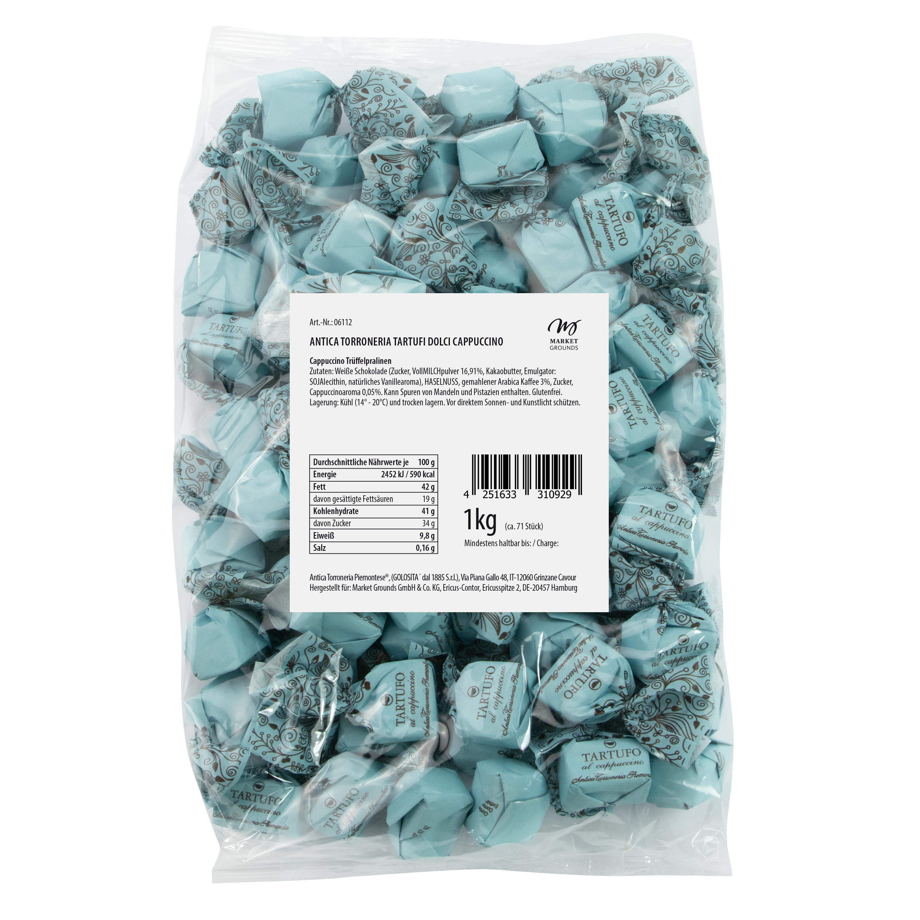 This white truffle praline delights with roasted hazelnuts, 3% Arabica coffee and a fine cappuccino aroma. The creamy, mild cappuccino flavor makes this praline a velvety, smooth delight, perfect for coffee lovers.