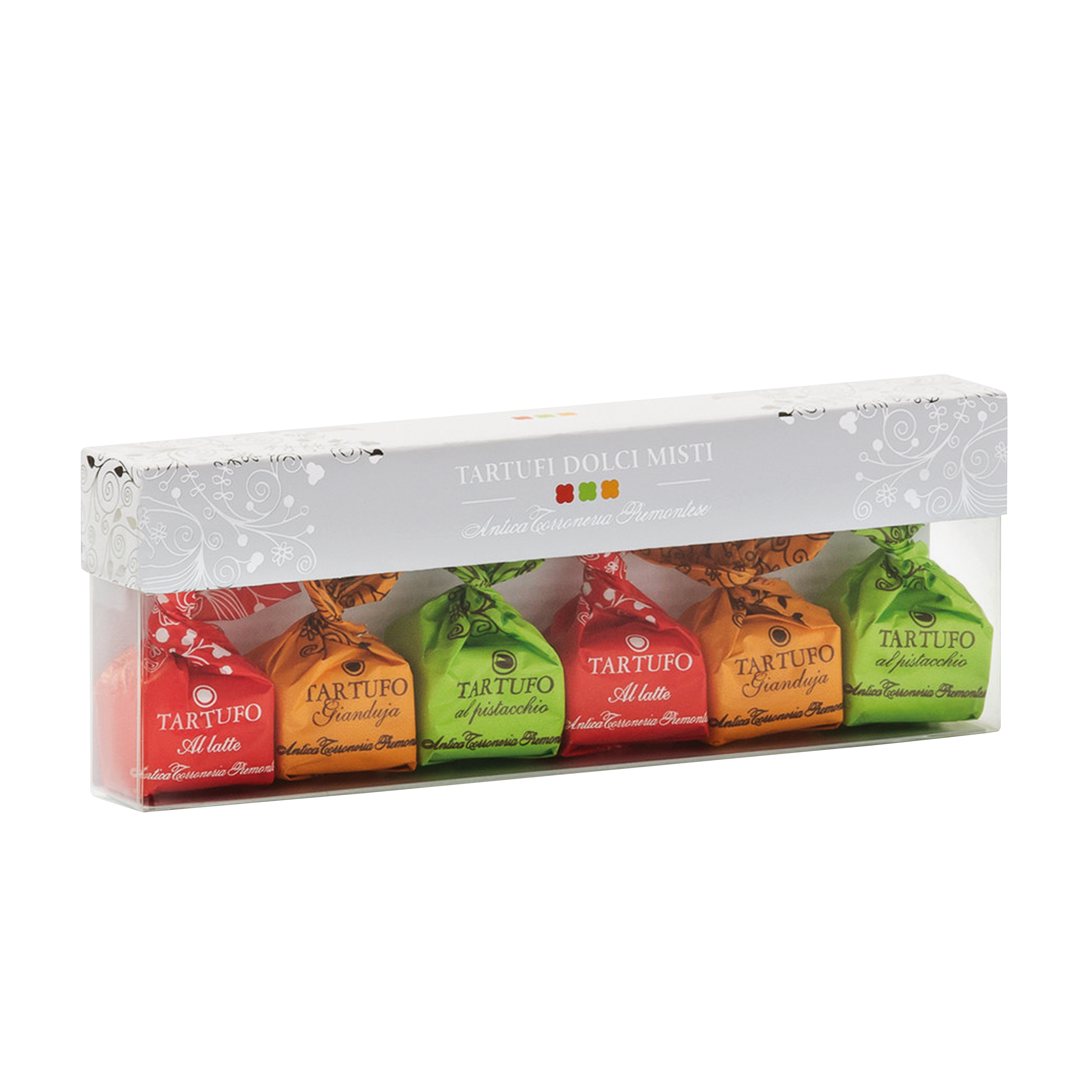 Packaged in an attractive transparent bar, our Tartufi Gianduja, Pralinato and Al Pistacchio offer an exquisite selection of fine chocolates. This mixture is ideal as an elegant gift or for personal enjoyment on special occasions.