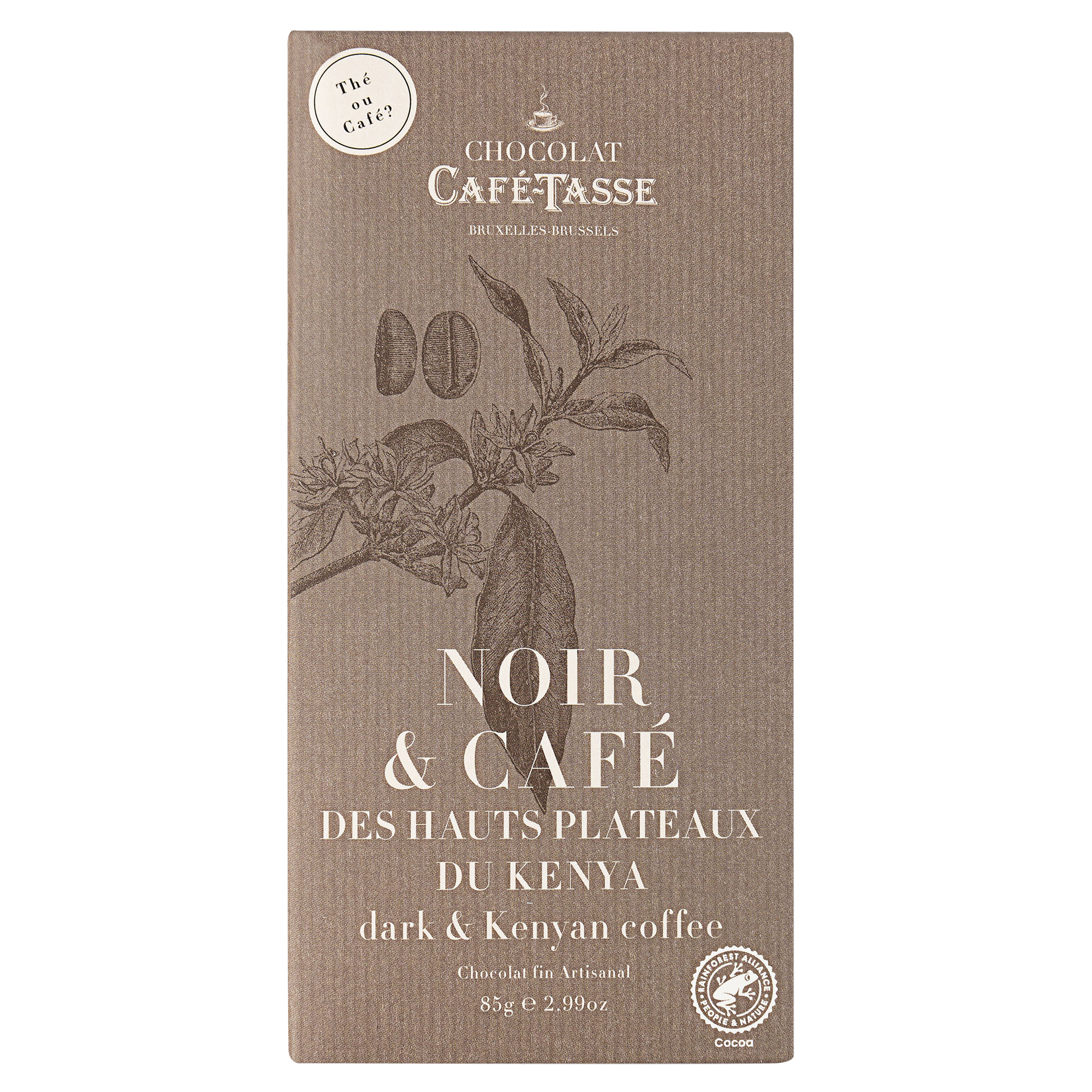 Eine außergewöhnliche Kombination: Zartbitterschokolade mit 60 % Kakaoanteil wird mit kenianischem Hochlandkaffee veredelt. Die gerösteten und gemahlenen Kaffeebohnen verleihen der Schokolade eine intensive, aromatische Tiefe.