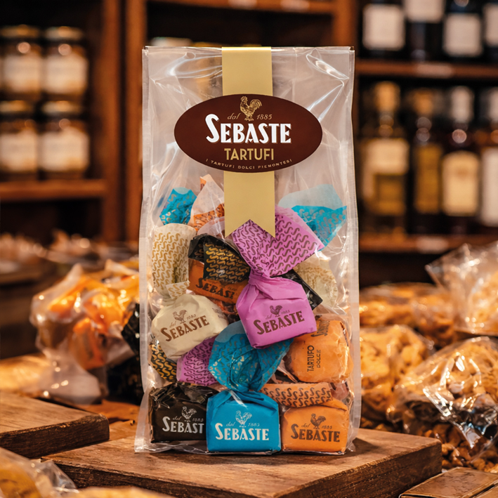 Die Sebaste Mixed Tartufi Bag bietet eine Auswahl von fünf unterschiedlichen Schokoladentrüffel-Varianten in einer praktischen Tüte, kombiniert feinste Schokolade mit charaktervollen Aromen und sorgt so für abwechslungsreichen, zart schmelzenden Genuss.