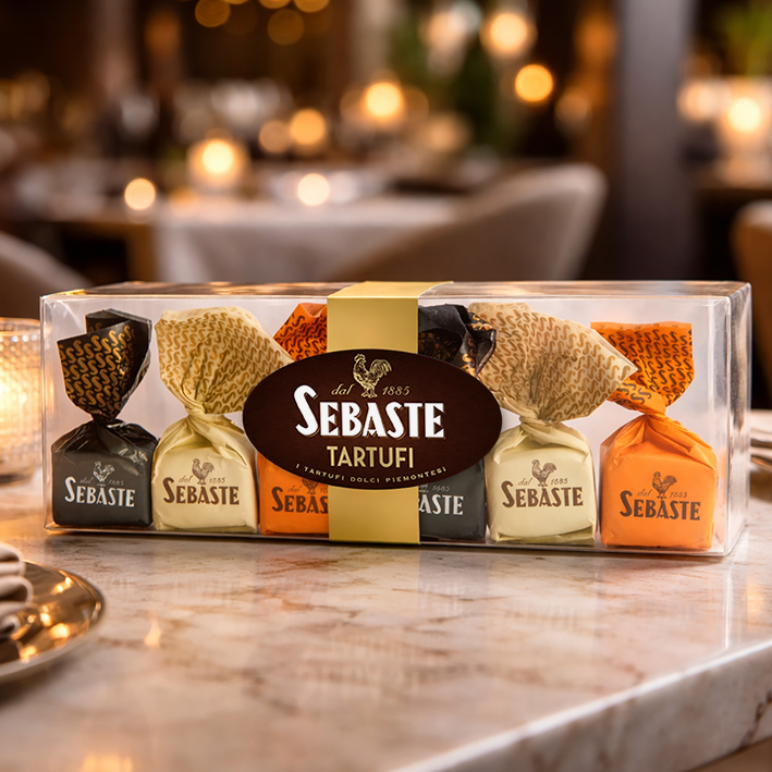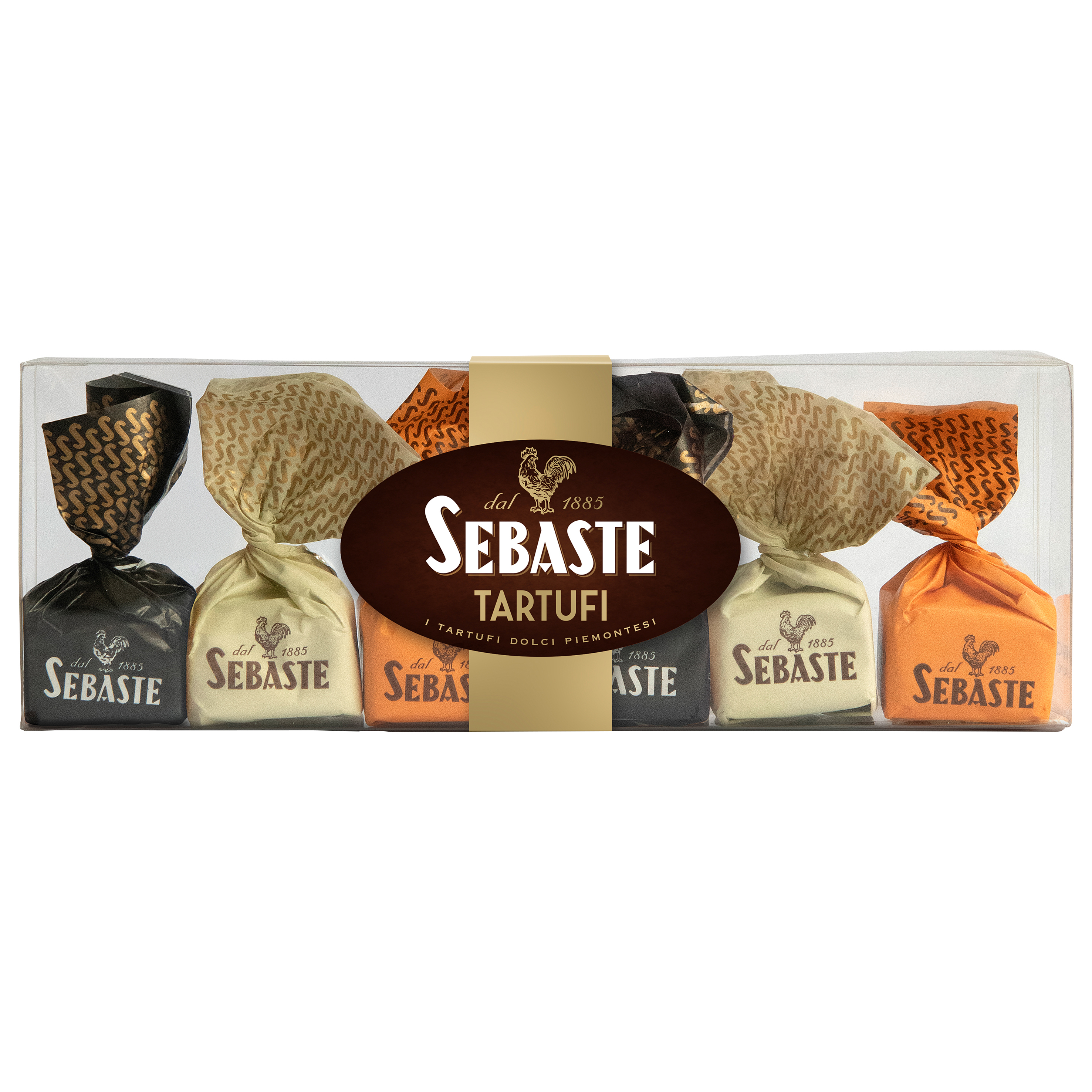 Die Sebaste Mixed Tartufi Gift Box Classic enthält eine Auswahl traditioneller Tartufi aus dunkler und weißer Schokolade mit gerösteten Haselnüssen, cremig im Schmelz und aromatisch im Geschmack, stilvoll verpackt als hochwertige Geschenkidee.
