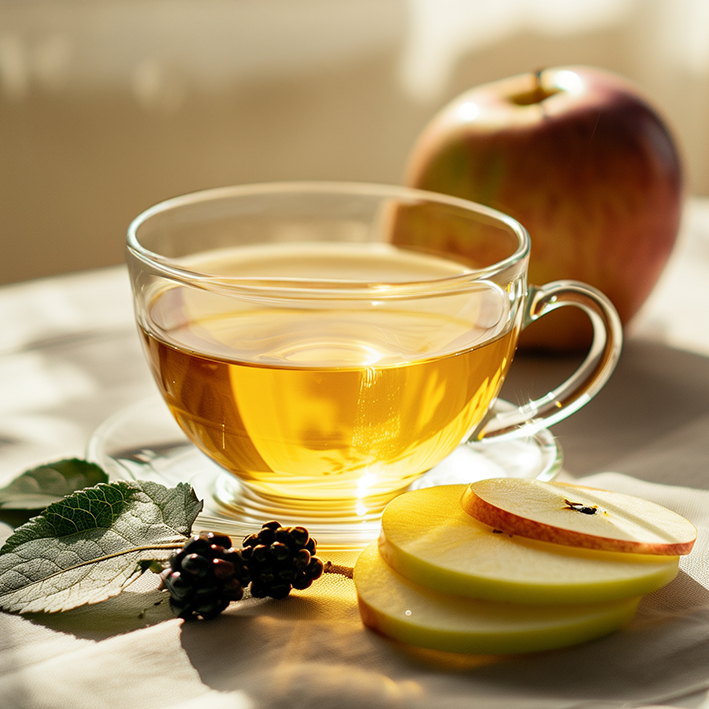 Apfel 65 %, Hibiskus weiß, süße Brombeerblätter, natürliche Aromen (Apfel, grüner Apfel).