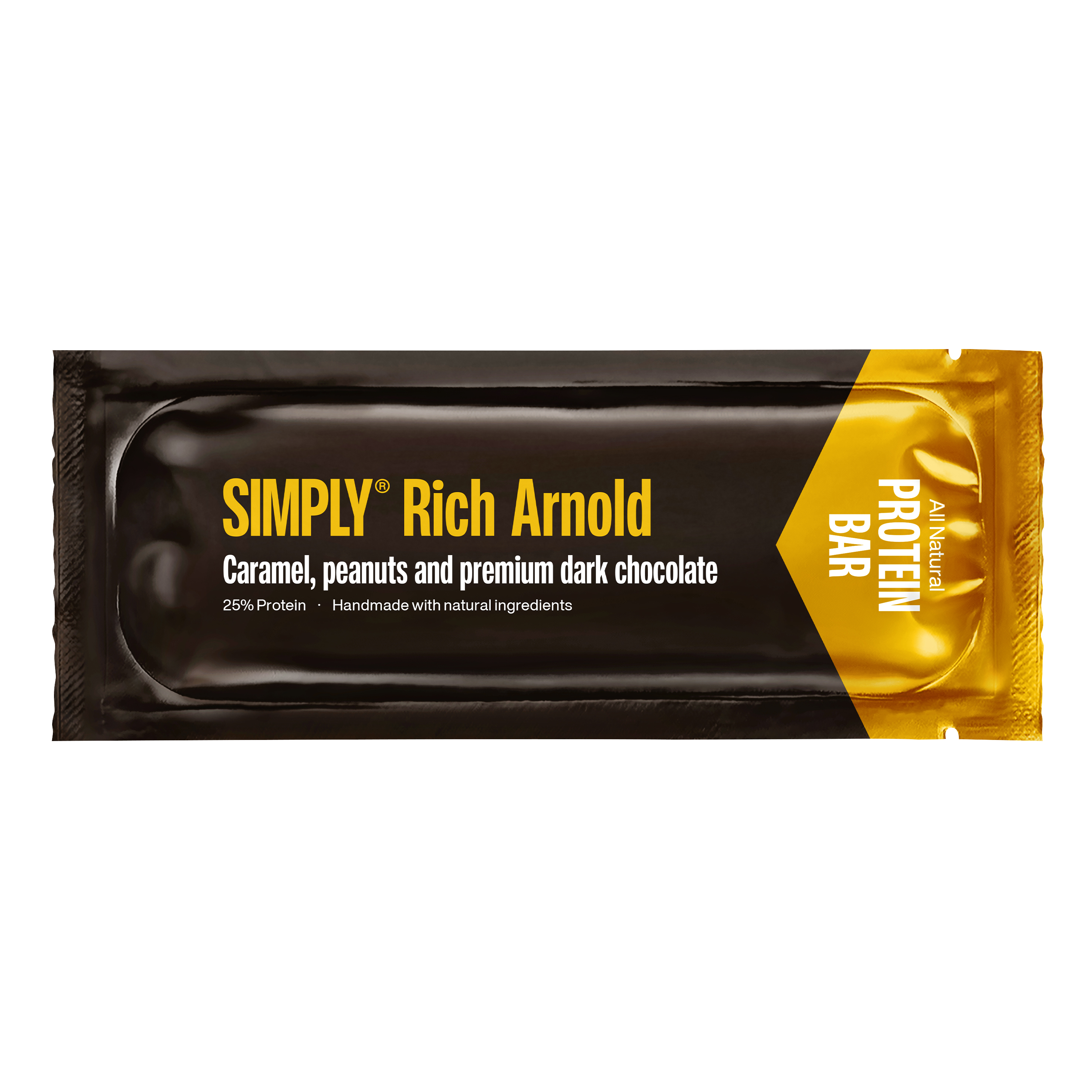 "Fuel your inner Arnold" mit Rich Arnold! Di"Fuel your inner Arnold" mit Rich Arnold! Dieser energiereiche Snack kombiniert süße Datteln, knackige Erdnüsse und zartes Karamell, umhüllt von dunkler Premium-Schokolade. Mit satten 28 g Protein pro Riegel ist er der ideale Begleiter für Fitnessliebhaber und alle, die auf eine ausgewogene Ernährung achten. Perfekt vor oder nach dem Training, bietet dieser Riegel nicht nur den nötigen Energieschub, sondern auch einen intensiven Geschmack, der Lust auf mehr macht. Jeder Bissen vereint süße, salzige und nussige Noten – der perfekte Snack für unterwegs oder als Belohnung nach dem Workout.eser energiereiche Snack kombiniert süße Datteln, knackige Erdnüsse und zartes Karamell, umhüllt von dunkler Premium-Schokolade. Mit 11 g Sojaprotein pro Riegel ist er der ideale Begleiter für Fitnessliebhaber und alle, die auf eine ausgewogene Ernährung achten. Perfekt vor oder nach dem Training, bietet dieser Riegel nicht nur den nötigen Energieschub, sondern auch einen intensiven Geschmack, der Lust auf mehr macht. Jeder Bissen ist eine Kombination aus süß, salzig und nussig - der perfekte Snack für unterwegs oder als Belohnung nach dem Workout.