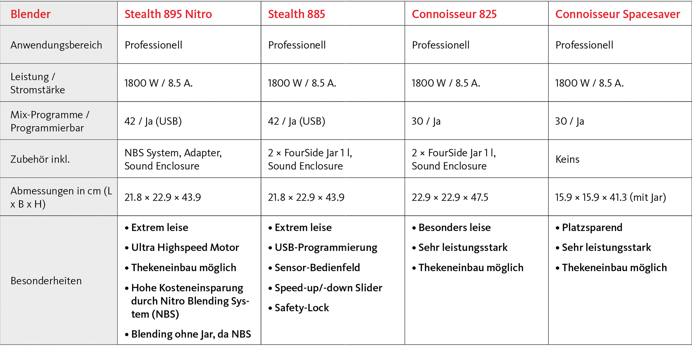 Die professionellen Hochleistungsmixer von Blendtec werden nach höchsten Standards gebaut und verfügen über eine hochentwickelte Blend-Technologie für perfekte Resultate in der Smoothie-Kreation und Lebensmittelvorbereitung. Blendtec steht für patentierte Behälter (BPA frei), stabile Sicherheitsklingen, einen robusten Sockel aus Hartmetall, einen Ultra-Hochgeschwindigkeits-Motor und einer intuitiven Bedienoberfläche.