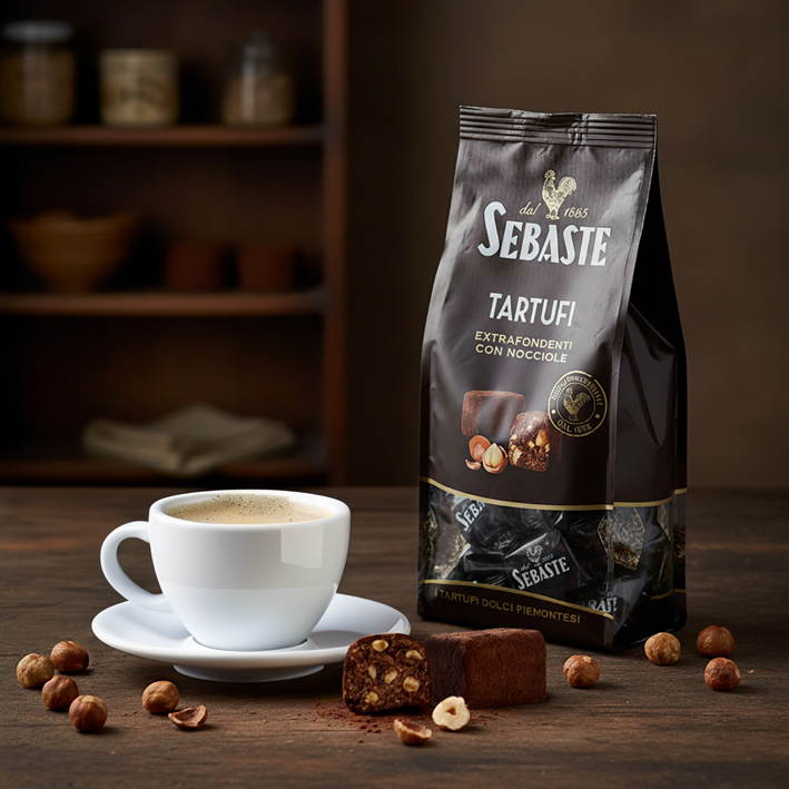 dunkle Schokolade 60% (Zucker, Kakaomasse, Kakaobutter. Emulgator: SOJALECITHIN. Aroma: Natürliche Vanille. Kakao Mindestens 52%), HASELNÜSSE, Kakaopulver, Zucker.