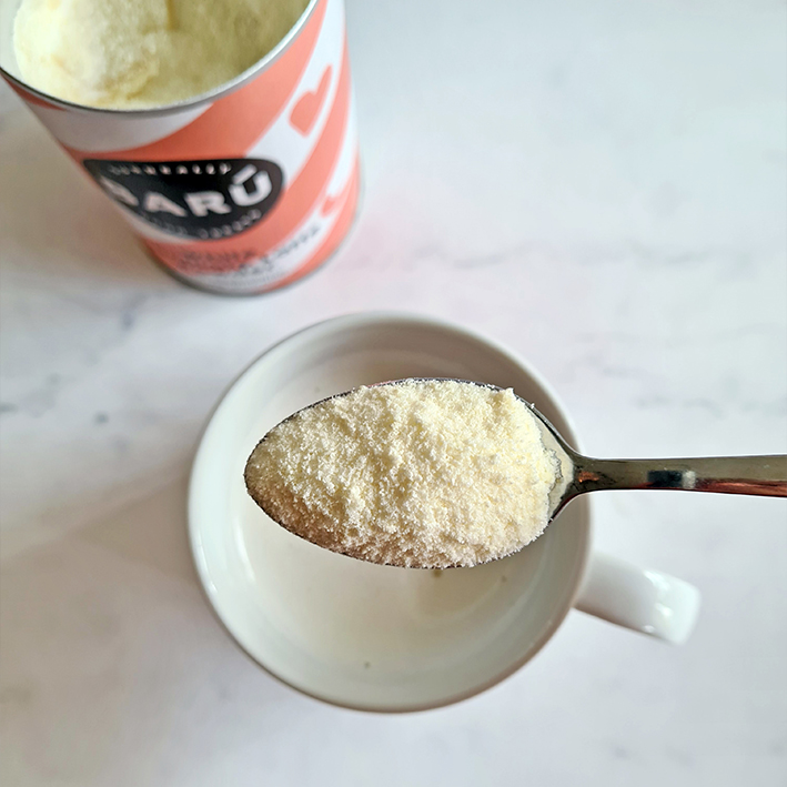 4 TL Pulver mit 200 ml heißer Milch verrühren.