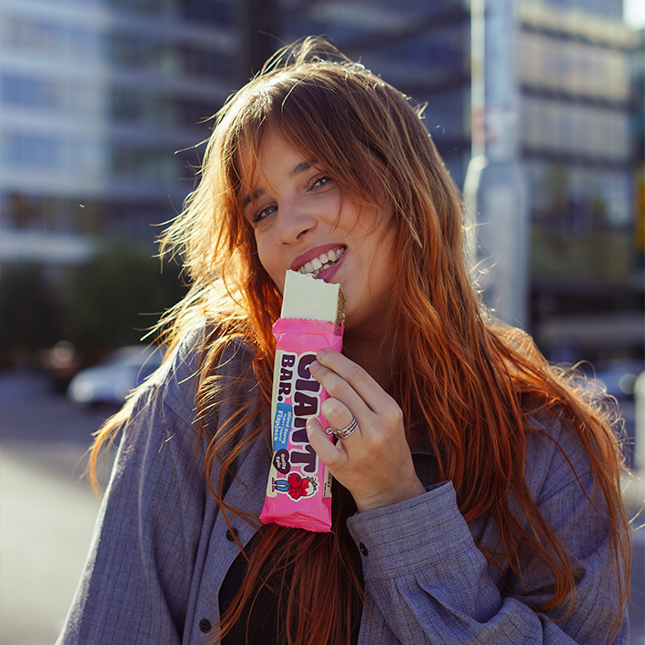 Vollkorn-HAFERflocken 34%, Joghurtüberzug 20% (Zucker, teilweise und ganz gehärtetes Palmfett, Joghurtpulver (MILCH) 8%, Molkenpulver (MILCH), Emulgator: Sonnenblumenlecithin; natürliches Aroma), pflanzliche Fette (Palm*, Raps), Zuckerrohrsirup, Rohrzucker, Kirschen (5%) (Kirschen, Glukose-Fruktose-Sirup, Zucker, Säuerungsmittel: Citronensäure, Farbstoff: Erythrosin), SOJAmehl, pflanzliches Glycerin, Kokosnuss, Aroma. Ursprung Hafer: EU und nicht-EU. *Das Palmöl stammt aus RSPO- zertifizierten Quellen.